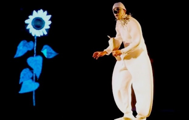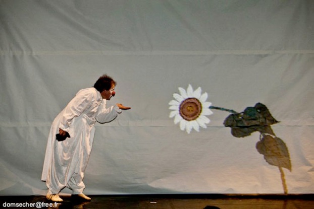 Tournesol interactif jouant avec un clown dans " Pentimento " de Madona Bouglione