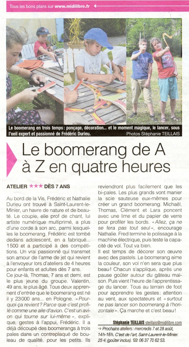 Prochains ateliers boomerang : les mercredis 7 et 28 août 2013